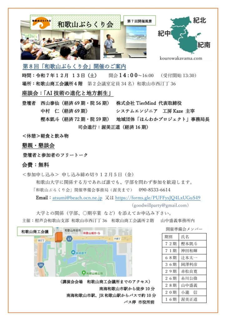 「第8回和歌山ぶらくり会」(主催:柑芦会和歌山支部)にて、当団体事務局長が講演を行いました! 「第8回和歌山ぶらくり会」(主催:柑芦会和歌山支部)にて、当団体事務局長が講演を行いました! 12月13日(土)、柑芦会和歌山支部様主催の「第8回和歌山ぶらくり会」にて、当団体の事務局長(樫本凱斗)が登壇いたしました。今回のテーマは「AI技術の進化と地方創生」。第一部にて、事務局長が基調講演として登壇し「ほんわかプロジェクト」での実践事例を交えながら、地域コミュニティとAIがどう共存し、発展していけるかについてお話しさせていただきました。さらに今回は、AI技術の実務の最前線でご活躍されている西山泰仙氏、中村仁氏をお迎えし、3名でのトークセッションも実施しました。日々凄まじいスピードで進化するAI技術。 それを単なる技術として終わらせず、私たち地域の人間が「どう使い、どう活かしていくか」。 実務家のお二人を交えた議論は非常に熱を帯び、これからの地方創生においてAI活用がますます重要になると確信できる時間となりました。貴重な機会をいただきました柑芦会和歌山支部の皆様、西山様、中村様、そしてご参加いただいた皆様、誠にありがとうございました。・Instagram 前 次